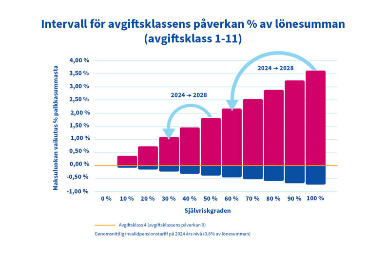 Sänkningen av självriskgraden gäller alla arbetsgivare som har en självrisk. Om en arbetsgivares självriskgrad tidigare var 100 %, kommer den år 2028 att vara 60 %. Om självriskgraden tidigare var 50 %, kommer den år 2028 att vara 30 %. När självriskgraden sänks, minskar avgiftsklassens inverkan. Framöver kommer alltså en mindre del av invalidpensionsavgiften att fastställas baserat på avgiftsklassen.