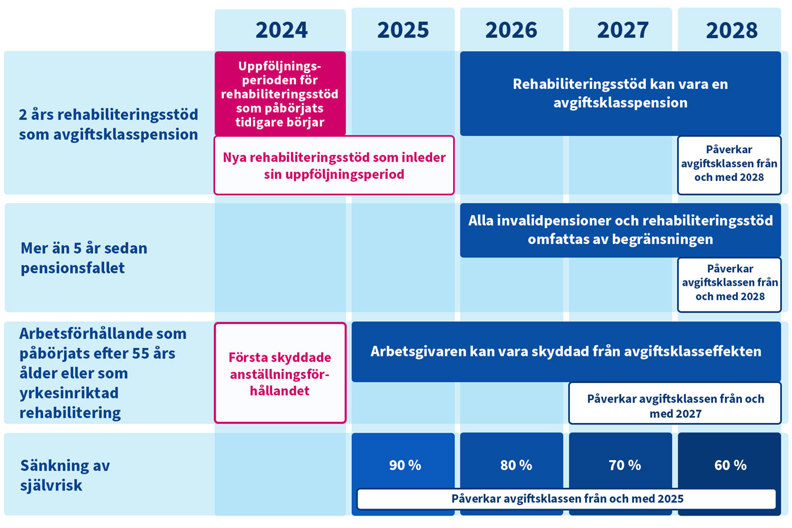 Självriskgraden för arbetsgivarens avgiftsklass sänks stegvis från den tidigare nivån till 60 %. Självriskgraden minskar med 10 % per år under 2025–2028. År 2028 kan självriskgraden uppgå till högst 60 %.