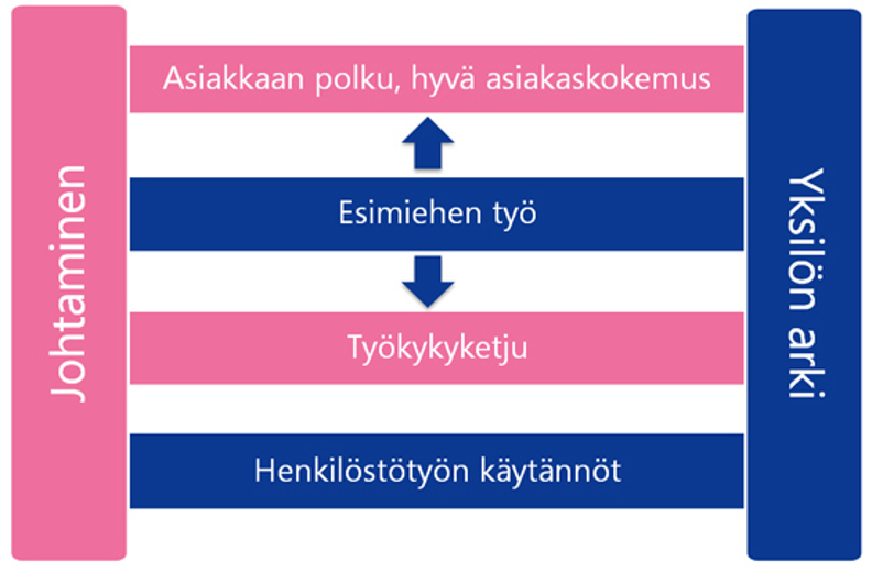Kolmanneksi: Pitäisi määritellä esimiehen hommia suhteessa asiakkaan palvelupolkuun ja työntekijän työkykyketjuun. Miten esimiehenä autan tiimiäni ymmärtämään asiakkaita, onnistumaan työssä sekä tunnistamaan ja korjaamaan häiriöitä asiakkaan polulla? Miten pysyn kartalla siitä, mitä ihmisille kuuluu, mikä heitä innostaa ja miten toimin, kun jonkun työt eivät suju tai joku sairastuu?