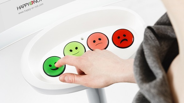 HappyOrNotin kehittämä palvelu konkretisoituu henkilöstön suuntaan fyysisen hymiölaitteen ja digitaalisten hymiönappien kautta.