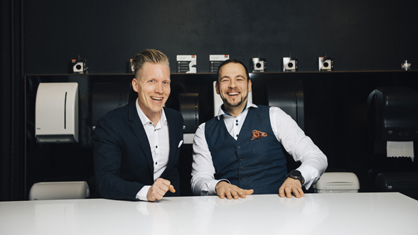 Kyse ei ole enää pelkästään veden ja energian säästämisestä. Digitalisaatio ja sensoriteknologia tuovat saniteettitiloihin uusia mahdollisuuksia, kertoo Novosanin Hanno Airas (oik.). Vieressä istuu toinen perustaja Tommi Virkki.
