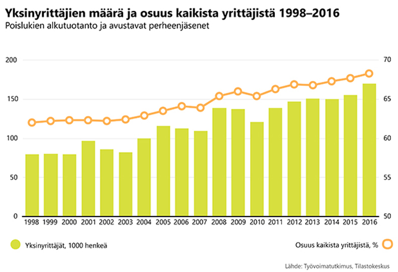 Samaan aikaan yksinyrittäjien määrä on kasvanut tasaisesti lukuun ottamatta viime vuotta.
