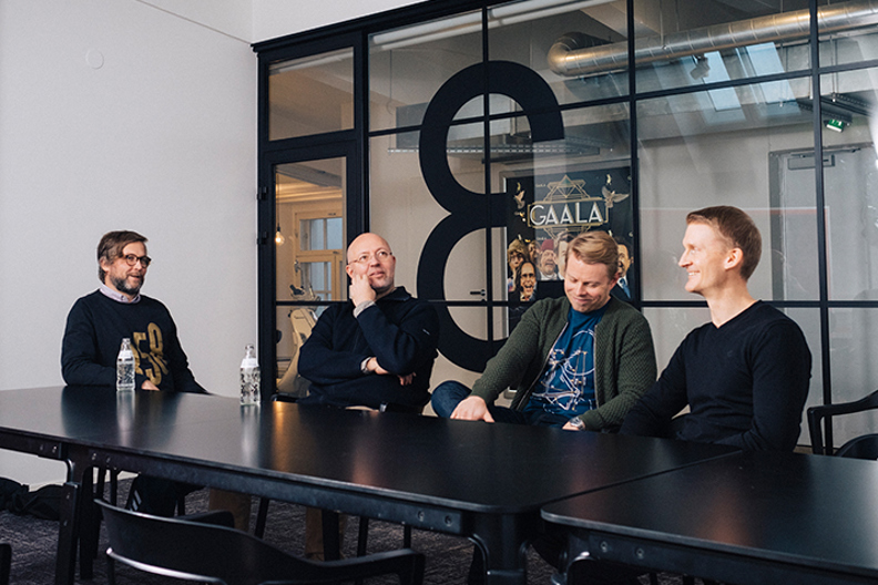 Avainosakkaat Ale Lauraéus (vas.) ja Verneri Leimu (toinen vas.) yhdessä uuden toimitusjohtaja Jani Leppäsen (toinen oik.) ja talousjohtaja Juho Pakkasen (oik.) kanssa.