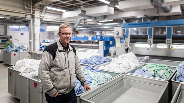 Yrityksen toimitiloissa Mikkelin Pitkäjärvellä kuuluu tasainen, mutta odotuksia pienempi melu. Työntekijät ottavat pestyjä vaatteita tai lakanoita koreista ja napsauttavat kiinni koneisiin. Työvaatteet kiertävät katossa kiskoja pitkin kuivauslinjalle. Lakanat suoristetaan 2010-luvun mankelissa.