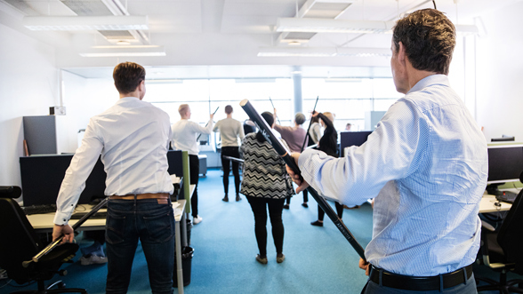 Aho alkoi pohtia, olisiko kyykky- ja keppijumppa vietävissä myös toimistoympäristöön ja vieläpä niin, että se ei aiheuttaisi kenellekään osallistumispakon tunnetta tai työssäoloahdistusta.