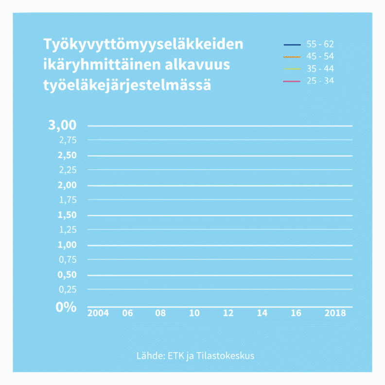 Keski-ikäisten työkyvyttömyysriski on vähitellen pienentynyt, kun suhteutetaan uudet työkyvyttömyyseläkkeelle siirtyneet oman ikäluokkansa kokoon. Yli 55-vuotiailla riski on suurempi kuin nuoremmilla työntekijöillä. Noin 140 000 suomalaista on työkyvyttömyyseläkkeellä.