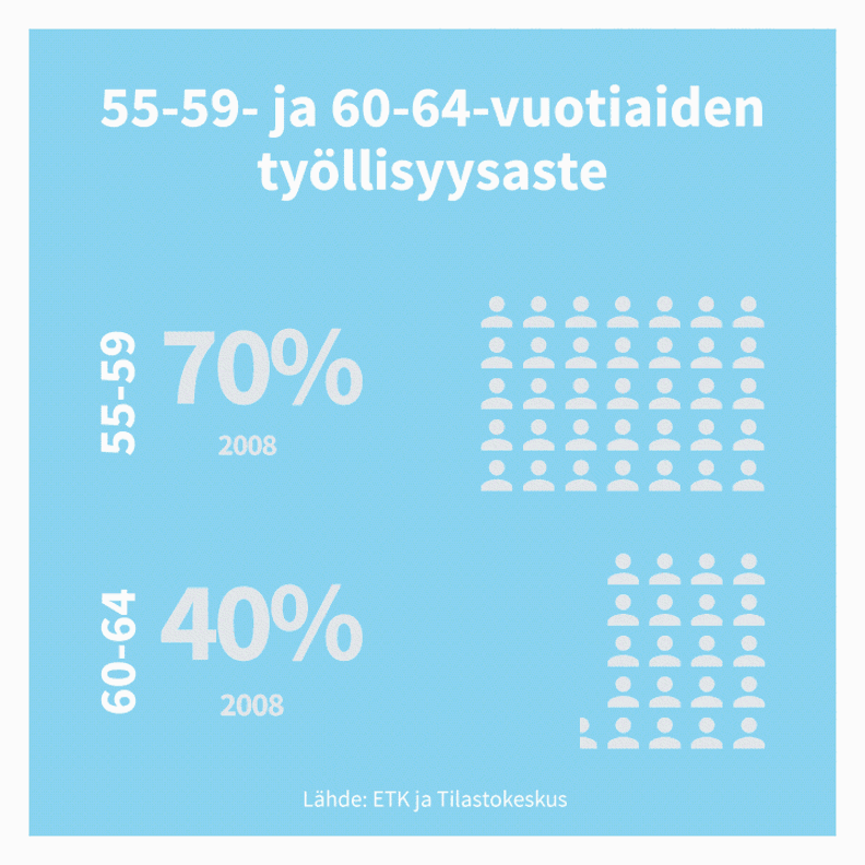 Ikääntyneiden suomalaisten työllisyysaste on noussut. Hyvästä kehityksestä huolimatta 55-64-vuotiaiden työllisyysaste on Suomessa edelleen alempi kuin muissa Pohjoismaissa. EU-maiden keskiarvo kohenee ja lähestyy Suomen tasoa.