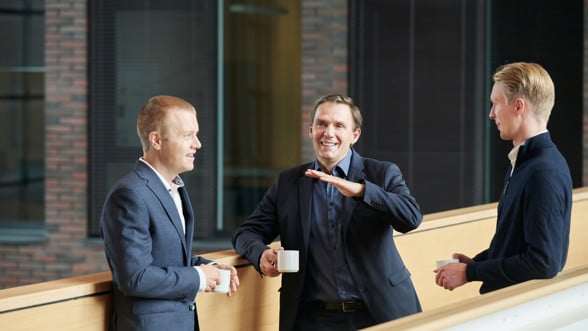 Harri Iisakka (kesk.) pääsi graduprojektissaan tutustumaan Varman sijoitustoiminnon osaajiin Markus Ahoon (vas.) ja Mikko Koivusaloon. Kuvasta puuttuu graduparin toinen osapuoli Olli-Markus Savolainen, jonka uusi työpaikka kuljetti Lontooseen.