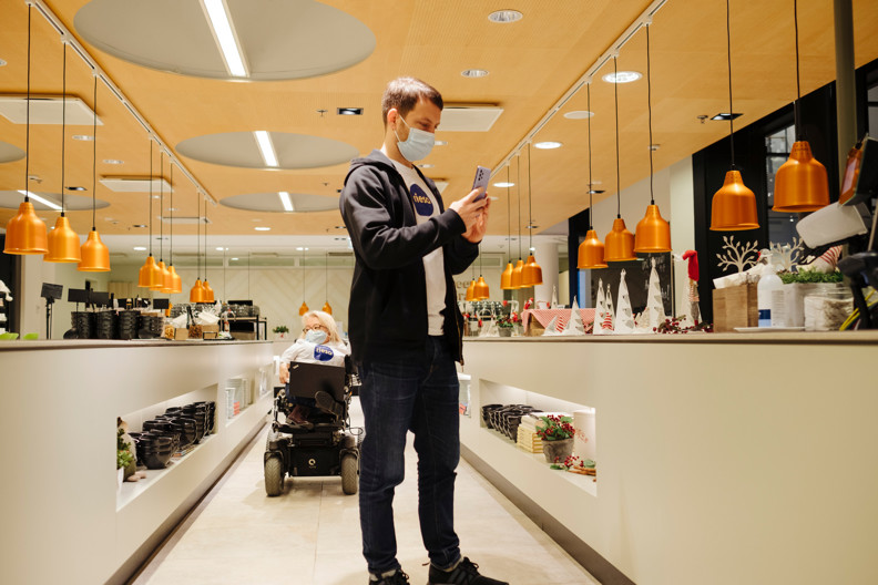 Nainen pyörätuolissa työpaikkaruokalan linjaston vieressä. Mies kuvaa tilaa kännykällä.