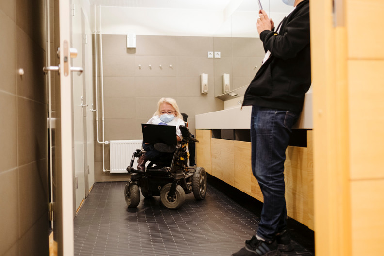 Nainen pyörätuolissa yrityksen wc-tiloissa.
