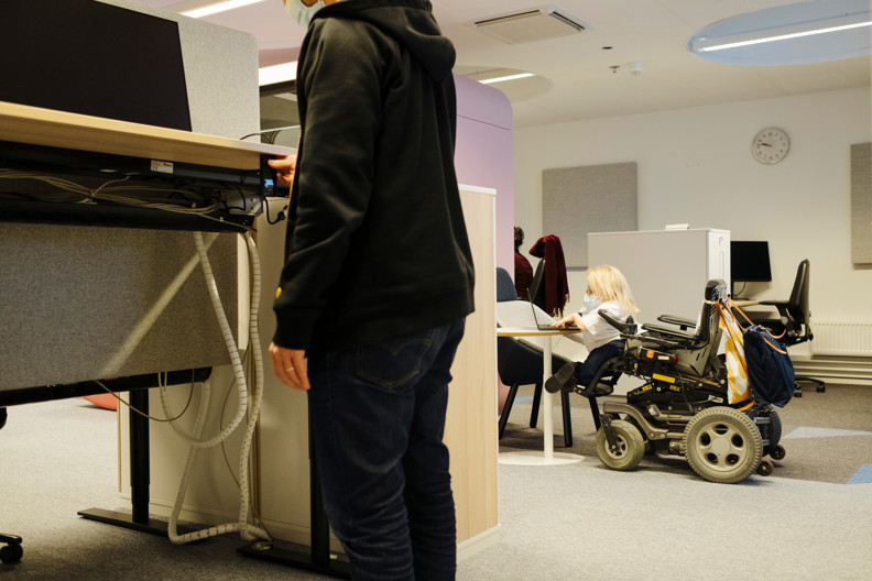 Mies käyttää sähköpöytää. Taustalla nainen istuu pyörätuolissa ja kirjoittaa tietokoneella.