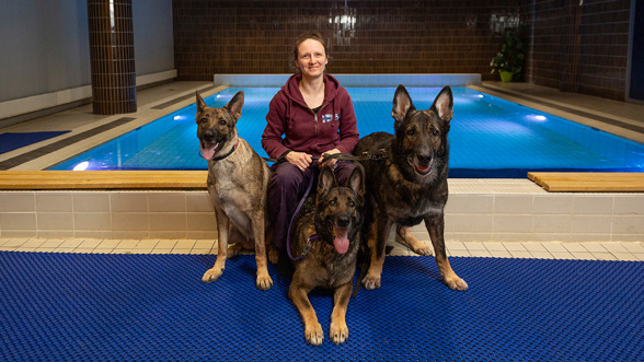 Koirauimala Sippuran yrittäjä Anne Juntunen on ottanut tänään saksanpaimenkoiransa työpaikalleen Salon keskustaan. Kaikilla on nyt hetki omaa aikaa ennen kuin iltapäivän ja illan maksavat asiakkaat saapuvat.