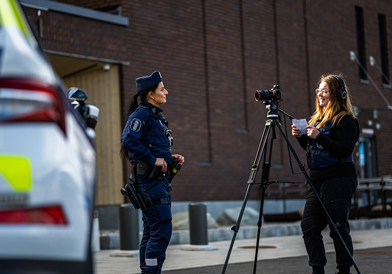 – Olen luonteeltani iloinen ja puhelias. Siitä on ollut hyötyä, kun olen etsinyt kameran eteen ihmisiä, toteaa Oulun poliisin viestintäsihteeri Paula Tavasti. Uuden Ruskonselän pääpoliisiaseman edustalla hän haastattelee ja kuvaa vanhempaa rikoskonstaapelia Ruusa Tiaista.