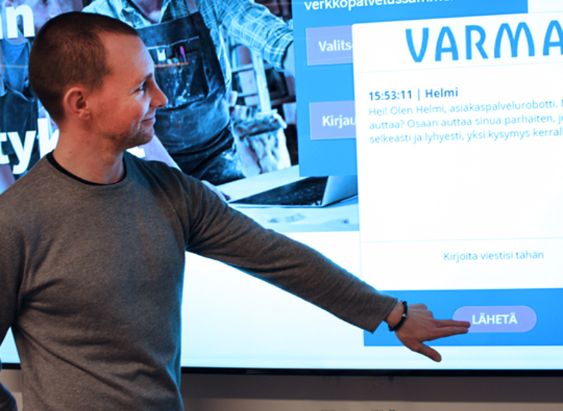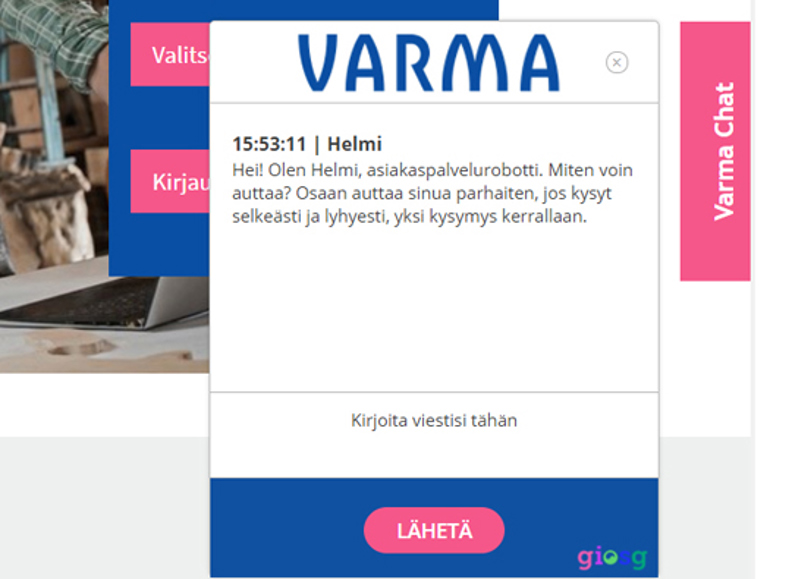 Varman vakuutus- ja eläkepalvelujen uusi asiakaspalvelurobotti Helmi, joutui heti uransa alkumetreillä vastaamaan verkkopalvelun chatissa asioivalle, että "Eipäs kiroilla, tuhmeliini!". Robotin työ chatissa ei ole aina näin värikästä. Yleensä Helmi vastaa opetetusti asiakaspalvelussa eniten kysyttyihin peruskysymyksiin ja opastaa Varman sivuilla oikean tiedon luo.