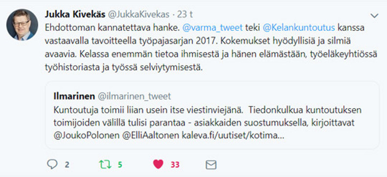 Tiedonkulun haasteet eri toimijoiden välillä nousivat esille, kun Kelan pääjohtaja Elli Aaltonen ja Ilmarisen toimitusjohtaja Jouko Pölönen kirjottivat Kalevan vieraskynäpalstalla maanantaina, että kuntoutuja toimii liian usein viestinviejänä eikä hänellä ole aina selkeää kuvaa, minne pitäisi seuraavaksi soittaa: terveydenhuoltoon, Kelaan vai työeläkelaitokseen.