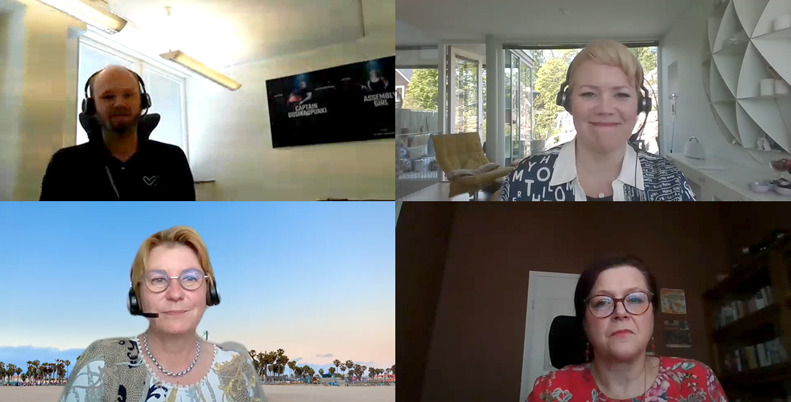 Valmet Automotiven Tomi Salo, Varman Katri Viippola, Keskon Johanna Larkio ja Atean Sarita Laras keskustelemassa edustamiensa yritysten koronatoimista.