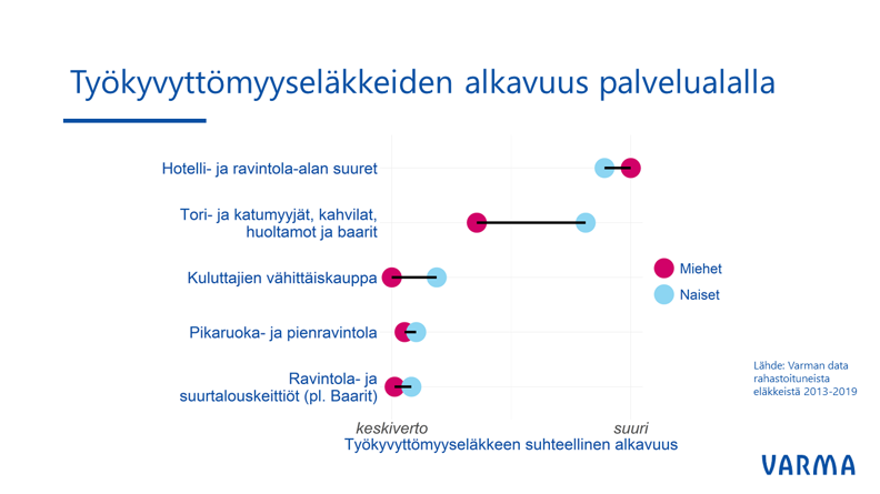 Varman eläkehakemuksia koskeva data osoittaa, että palvelualalla korkein työkyvyttömyyseläkkeen alkavuus on hotelli- ja ravintola-alan suurissa yrityksissä. Seuraavaksi eniten eläkkeitä alkaa ammattiryhmässä, joka kattaa palvelualan työntekijät kahviloissa, huoltamoilla, baareissa sekä torikaupassa.