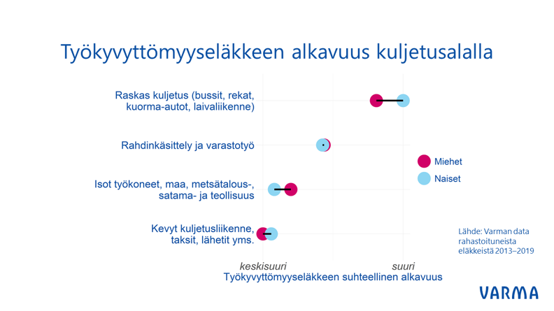Varman eläkehakemuksia koskeva data osoittaa, että kuljetusalan työtehtäviä sisältävillä yrityksillä on suurempi työkyvyttömyyseläkkeen alkavuus kuin Varman asiakasyrityksissä keskimäärin. Kuljetusalalla korkein alkavuus on raskaan kuljetuksen yrityksissä ja toiseksi korkein rahdinkäsittely- ja varastotyössä. Myös sukupuolten välillä on eroja. Raskaassa kuljetuksessa naisilla työkyvyttömyyseläkkeiden alkavuus on huomattavasti suurempi kuin miehillä. Vuosina 2018–2021 työkyvyttömyyseläkkeelle jääneistä 79 prosenttia oli yli 55-vuotiaita.