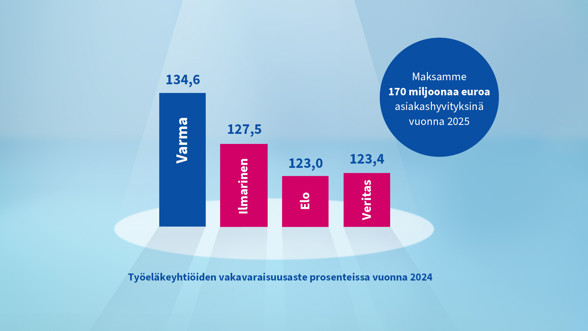 Varma on vakavaraisin työeläkeyhtiö, joten saat meiltä erinomaiset asiakashyvitykset. Olemme maksaneet parhaat asiakashyvitykset jo 18 vuotta, ja meillä on mainiot edellytykset maksaa parhaat asiakashyvitykset myös tulevina vuosina.