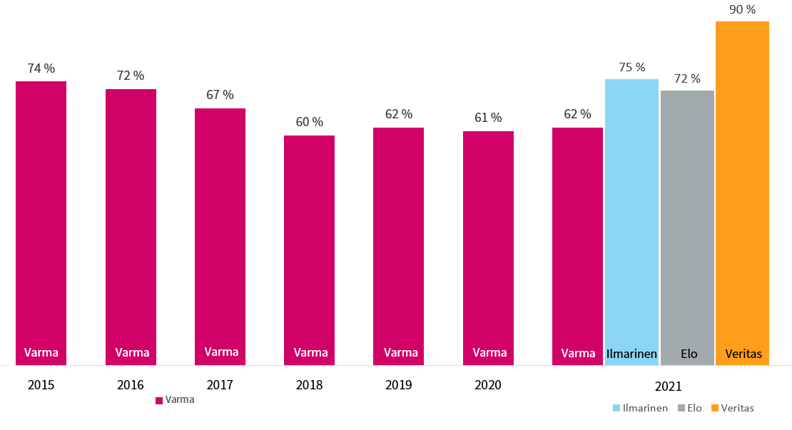 Varman asiakashyvitysprosentti on ollut vuodesta 2012 asti koko ajan korkeampi kuin Ilmarisen, Elon ja Veritaksen. Varman asiakashyvitysprosentti on korkein, Ilmarisen toiseksi ja Elon kolmanneksi korkein. Veritaksen asiakashyvitysprosentti on pienin.