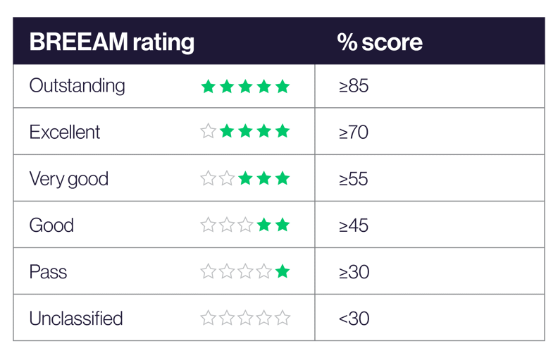 Taulukossa on esitelty kaikki BREEAM arvosanat raja-arvoineen. Tyypillisin arvosana Varman asuinkohteilla on Very good.