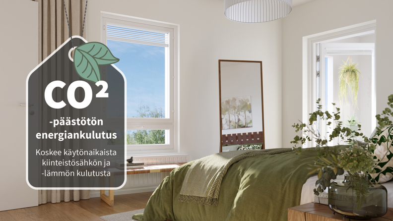 Osassa asuinkiinteistöjämme taloyhtiön käyttöaikainen kiinteistösähkö ja lämpö ovat hiilidioksidipäästöttömiä. Tämä tarkoittaa, että kiinteistölämpö on tuotettu joko uusiutuvan kaukolämmön tai maalämmön kautta ja kiinteistösähkö on uusiutuvaa. Käytämme näiden asuntojen asuntoilmoituksissa CO2-päästötön energiankulutus -merkkiä.